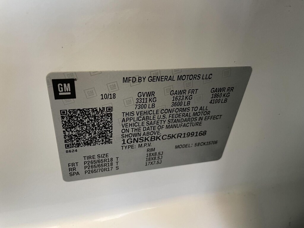 SUSPENSION PACKAGE, PREMIUM SMOOTH RIDE, EMISSIONS, CONNECTICUT, DELAWARE, MAINE, MARYLAND, MASSACHUSETTS, NEW JERSEY, NEW YORK, OREGON, PENNSYLVANIA, RHODE ISLAND, VERMONT AND WASHINGTON STATE REQUIREMENTS, ENGINE, 5.3L ECOTEC3 V8 WITH ACTIVE FUEL MANAGEMENT, DIRECT INJECTION AND VARIABLE VALVE TIMING, TRANSMISSION, 6-SPEED AUTOMATIC, ELECTRONICALLY CONTROLLED, REAR AXLE, 3.08 RATIO, WHEELS, 18 X 8.5 (45.7 CM X 21.6 CM) ALUMINUM WITH HIGH-POLISHED FINISH, TIRES, P265/65R18 ALL-SEASON, BLACKWALL, TIRE, SPARE P265/70R17 ALL-SEASON, BLACKWALL, PAINT SCHEME, SOLID APPLICATION, SUMMIT WHITE, SEATS, FRONT BUCKET WITH LEATHER-APPOINTED SEATING, JET BLACK, LEATHER-APPOINTED SEAT TRIM, AUDIO SYSTEM, 8 DIAGONAL COLOR TOUCH-SCREEN WITH CHEVROLET INFOTAINMENT, LUXURY PACKAGE, KEYLESS START, PUSH BUTTON, FOG LAMPS, MIRRORS, OUTSIDE HEATED POWER-ADJUSTABLE, POWER-FOLDING AND DRIVER-SIDE AUTO-DIMMING, LICENSE PLATE FRONT MOUNTING PACKAGE, LIFTGATE, POWER, HANDS FREE, SEATS, SECOND ROW 60/40 SPLIT-FOLDING BENCH, POWER RELEASE, SEATS, HEATED SECOND ROW OUTBOARD SEATS, SEATS, THIRD ROW 60/40 SPLIT-BENCH, POWER FOLD, STEERING COLUMN, POWER TILT AND TELESCOPIC, STEERING WHEEL, HEATED, LEATHER-WRAPPED AND COLOR-KEYED, PASSIVE ENTRY SYSTEM, FRONT AND REAR PARK ASSIST, REAR CROSS TRAFFIC ALERT, LANE CHANGE ALERT WITH SIDE BLIND ZONE ALERT