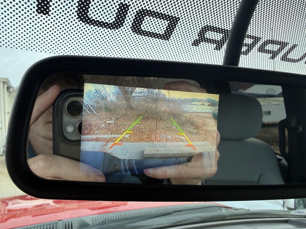 - Includes reverse camera mounted to tailgate handle bezel and video display contained in interior self-dimming rear-view mirror.